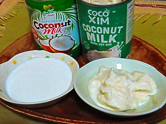 数多いココナッツミルクの中でもベトナム産の製品は安価なのが特長です。肝心の品質は? 両製品を更に取り出して比較してみましょう。