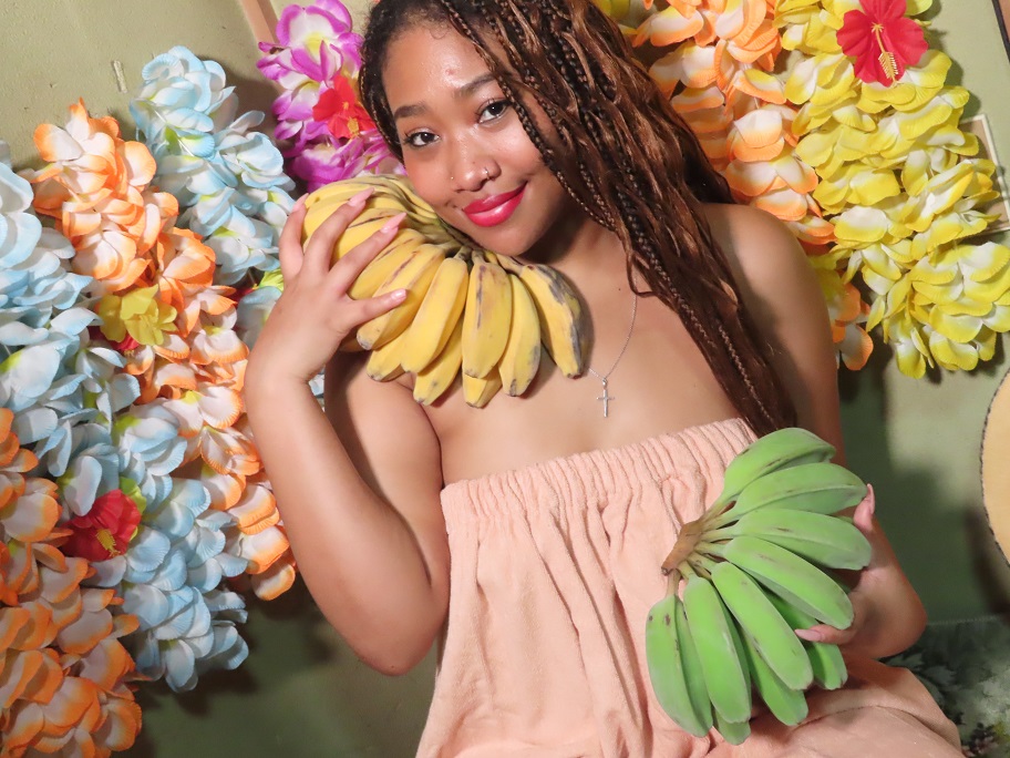フィリピンバナナで南国ムードたっぷりなポーズを決めるモデルさんが羽織っているガウンはエステ用品。当店ではこれを、本来の用途とは異なり緊急災害用品として常備しております。