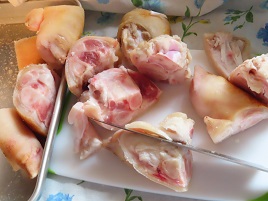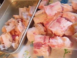 可食部は、左の奥に見えるほうです! 手前側が骨格部位ですから、廃棄部分が多いんですよねぇ。他の部位と比べると、豚足ってわりとお安いのですが、、こうゆう事か (~_^;