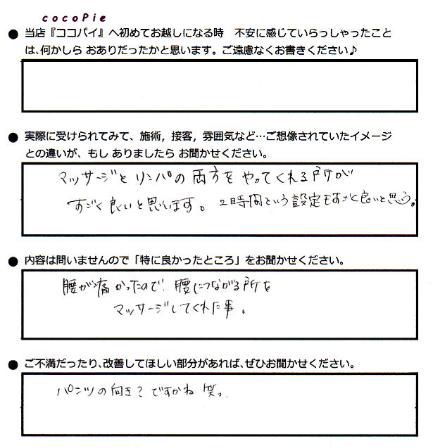 腰が痛かったので、腰につながる所をマッサージしてくれた事。