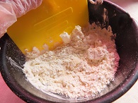 油酥(ヨウスゥ)と呼ばれる「油脂で作る生地」を作ります。小麦粉40gとラード20gを混ぜ合わせてから冷蔵庫で冷やしておく。