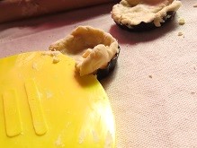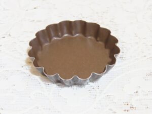 生地を薄く伸ばして、小型のタルト型に敷き詰めます。型からはみ出した部分はドレッジで切り落としましょう。