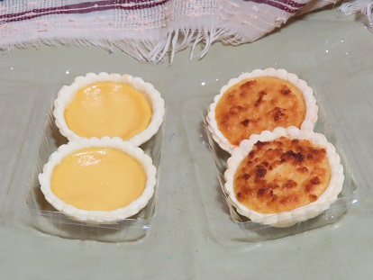 横浜中華街で買ったエッグタルト(左)とココナッツタルト(右)です。私が味見した限りでは、両方とも《香港式》だと感じました。生地がサクサクしていなくてタルト生地っぽかったからです。